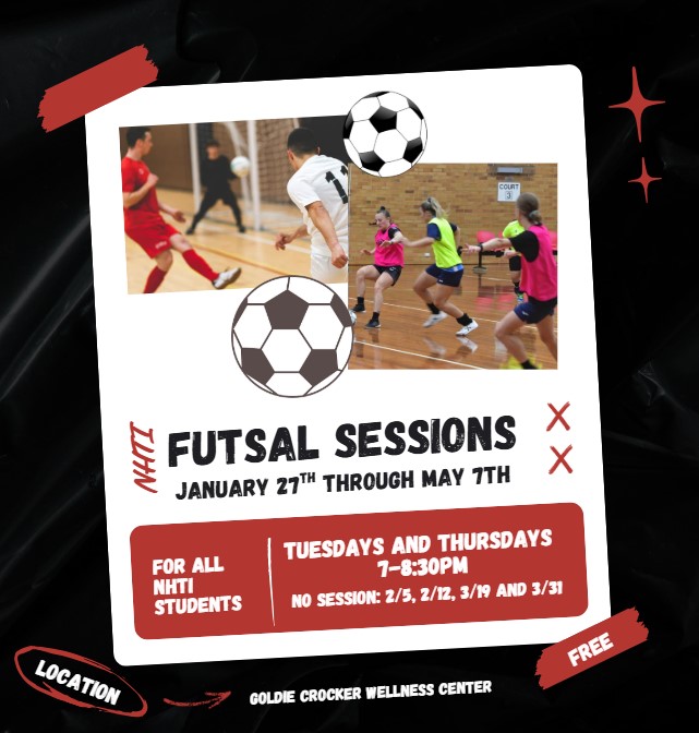 Join us for NHTI FUTSAL Open Gym sessions all semester long at the Goldie Crocker Wellness Center Gymnasium.